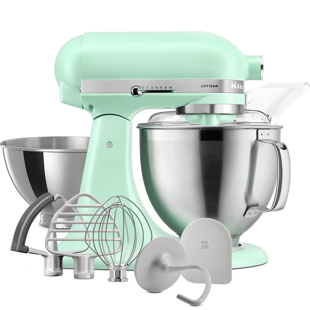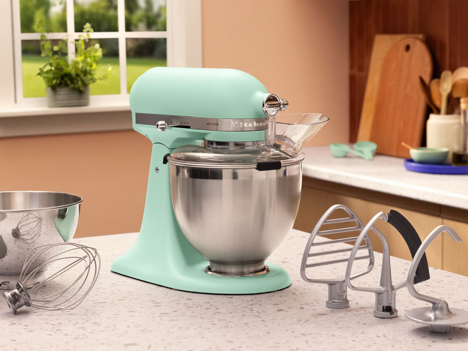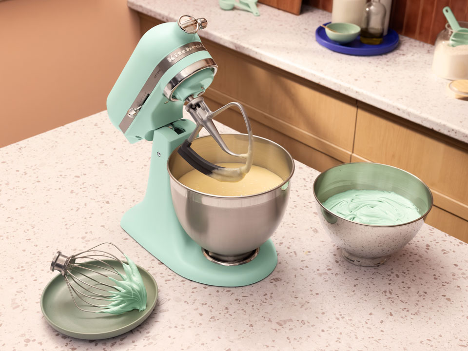 Wprowadź do swojej kuchni falę spokojnej, a przy tym ożywczej energii dzięki temu podnoszącemu na duchu mikserowi stojącemu w kolorze miętowej zieleni. To świeży odcień w chwilach, które inspirują równowagę i radość w każdym dziele, od purée po bezy, od ciasta po naleśniki.
